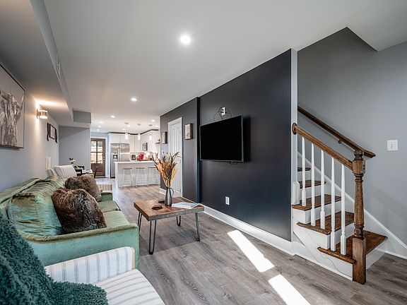 Living room equipped with the luxurious queen size pullout, comfort sleeper sofa and recliner chairs. There is a smart TV with a fire stick. Dining area on the left with seating for 4 at the table and 4 more barstools at the countertop for a total of 8 seats in the dining area. Enter the fully equipped kitchen with a Keurig, coffee machine, drip coffee, machine, ground, coffee, and pods,olive oil, knife block, silverware, cooking, utensils, bowls, plates, cups, wine glasses, Tupperware, spices, baking dish, baking sheet, mixing bowls, blender, air fryer, electric tea kettle, toaster, pots, and pans, microwave, dishwasher, stove, and refrigerator.