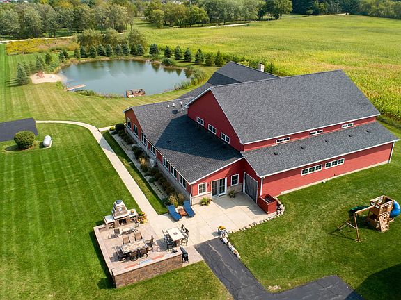 A complete country retreat, 75 rolling acres with pond. This unique property has a main house, rec building, 2 barns and potential second home. The primary residence is a 2 story secluded in the middle of the property. It has a formal living room with fireplace and formal dining room with butler's pantry. The kitchen has quartz counters and large island with breakfast bar. The kitchen and adjoining family room open out to the composite deck across the back of the home. Front and rear stairs lead up to 4 good sized bedrooms and 3 full baths. The large master suite has a private balcony overlooking the farm. The walkout lower level adds more living space with home theater, kitchen, full bath, rec room with fireplace, potential 5th bedroom and screen porch. There is an elegant fountain in the front courtyard and waterfall in the garden in the backyard. The 7,000 sq. ft. rec building has a 20' x 40' pool, hot tub, sauna, exercise room, full bath and changing room. For entertaining the 35' x 37' party room has 18' vaulted beamed ceiling, wood burning fireplace, wet bar and full kitchen. There are 2 large multi purpose rooms that open out to 2 patios with outdoor kitchen. The pond is approximately 15' deep with sand beach, floating raft and aerators. It is stocked with bass and bluegill. The 42' x 64' metal pole building has concrete floor, heated shop and two 12' overhead doors. The original 100 year old 2 story barn is 32' x 60' with newer siding and roof. The original one story house needs renovation but could make a nice guest house or caretaker residence. Brining nature home there is a wild flower/butterfly garden. Approximately 65 acres are productive farmland rented annually. The property is zoned A-1, agriculture in unincorporated McHenry County. There is much more here and we would be happy to provide more detail. Family compound or corporate retreat, there are many possibilities. Be sure to watch the drone video for a good look at the property.