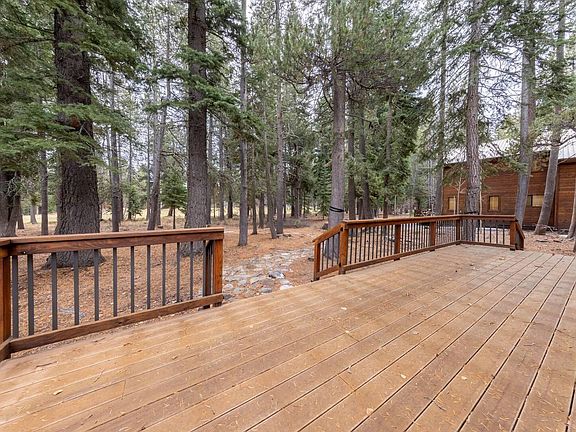 The living room is a bright and welcoming space with a flat-screen TV and a toasty wood-burning fireplace. Two comfy chairs invite you to relax by the fire with a cup of hot chocolate, creating perfect moments with your loved ones. The updated kitchen is equipped with top-of-the-line appliances and has everything you need for your culinary adventures. Indulge in a glass of red or craft a martini at the charming wine bar adjacent to the sunlit dining area. Step outside onto the back deck, surrounded by majestic pines and offering lovely views of Tahoe Donner's 5th Fairway in the distance.