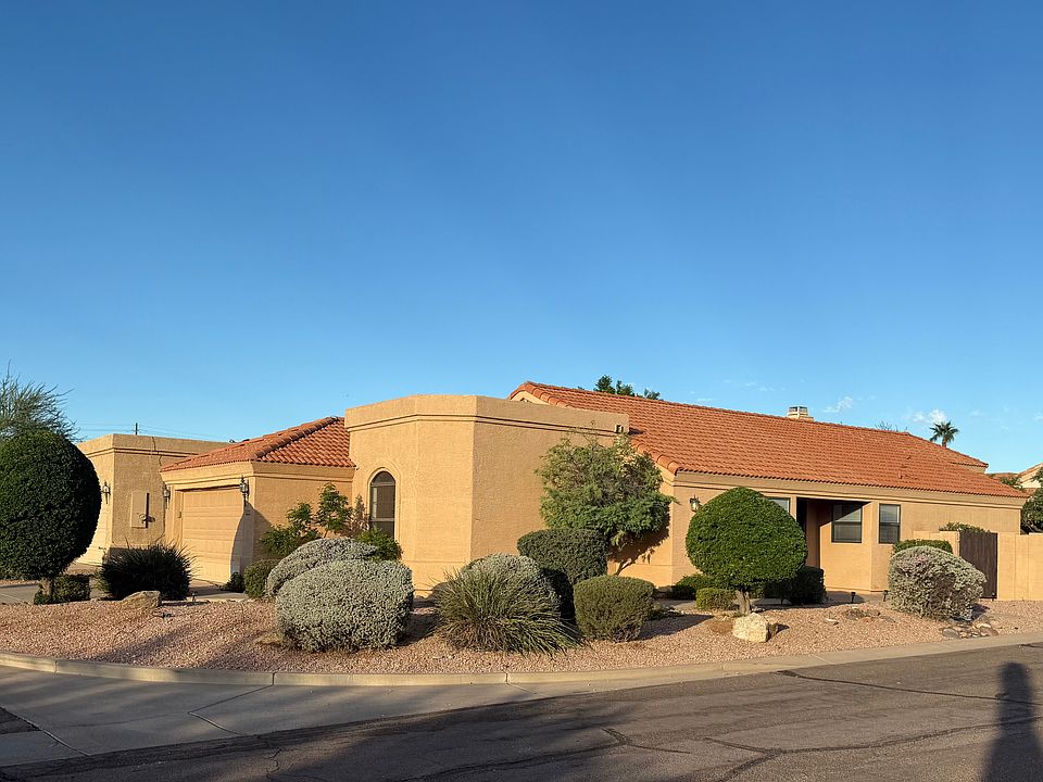 Freshly painted complete inside. New window blinds. Clean open 2 BR 2 Bath with office in a lovely 1640 sq ft home in Morningside area in Fountain Hills. 2 car garage with new epoxy garage floors. Purified water system for the whole house. Private backyard and two patios. Community pool and spa. Close to Fountain/park and shops.