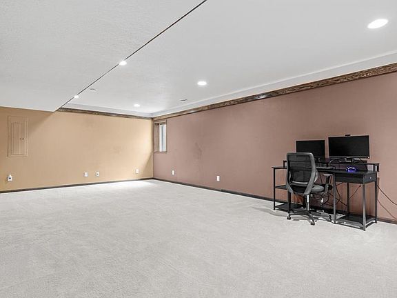 The finished lower level is the ultimate hangout space complete with built-in speakers, a new bathroom, and a wet bar rough-in. Ideal for movie nights or game days.