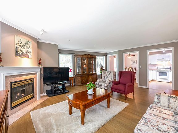 Enjoy this immaculate 1,367 sqft rancher like, WHEELCHAIR ACCESSIBLE Strawberry Hill condo. This SOUTH FACING 2 bedroom, 2 bath, freshly painted, centrally located condo is move-in ready. It features a large airy living room w/ crown moulding, big windows & plenty of natural light, in floor radiant heat, newer flooring & 2 fireplaces. Kitchen is equipped w/ ample counter & cupboard space, white appliances & adjacent nook. The primary bedroom is large enough for all your furniture & the ensuite is a fully walk in bathroom & shower. Walkout garden patio extends your living space, perfect for your green thumb. For your convenience, it has its own in suite laundry, storage & TWO PARKING STALLS. Enjoy the proximity to schools, daycare, transit, library, shopping, temples, Hwy 10 & Bridges.