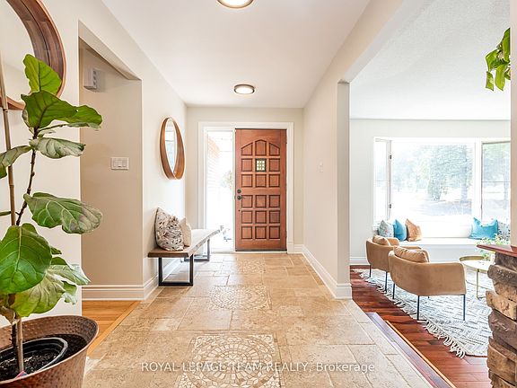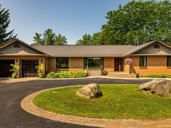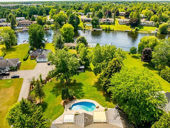 A rare offering along a serene stretch of the Rideau River just moments from the heart of Manotick, this exceptional 3-bedroom, 2.5-bathroom estate bungalow is set on a beautifully landscaped 2.25-acre lot with 60 feet of pristine waterfront. A private paradise, the property features a resort-style backyard with a gorgeous salt water in-ground pool, mature trees, and sweeping views of the river. Step inside to discover a grand entry adorned with travertine marble flooring, leading to a spectacular library crowned by a vaulted cedar-plank ceiling. Floor-to-ceiling bookshelves, complete with a rolling ladder, create an atmosphere of refined charm, while a dramatic double-sided fireplace connects this space to the expansive sunken living room and rear deck beyond. The chef's kitchen is a showpiece, seamlessly open to the main living areas; designed for both entertaining and daily luxury. Rich granite countertops, an abundance of custom cabinetry, and a high-end gas range are paired with a unique breakfast nook offering warmth and style. Bathed in natural light, the four-season sunroom is a seamless extension of the living space, with multiple sliding glass doors opening to the tranquil grounds. The primary suite is a true retreat, with direct access to the deck, a cozy gas fireplace, custom walk-in closet, and an opulent 5-piece ensuite complete with double vanities, soaking tub, and glass-enclosed shower. The partially finished lower level with new flooring & 9ft ceilings offers flexibility for additional living or recreation space. Recently updated landscaping and a lush canopy of mature trees provide privacy and timeless beauty. Nestled in one of Ottawa's most coveted communities, this home is just minutes from boutique shops, fine dining, excellent schools, and the village charm that makes Manotick so desirable.
