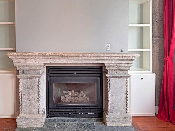 Reclaimed fir floorsSuquet stone fireplaceSleek modern counter topsGas stoveIn suite laundry