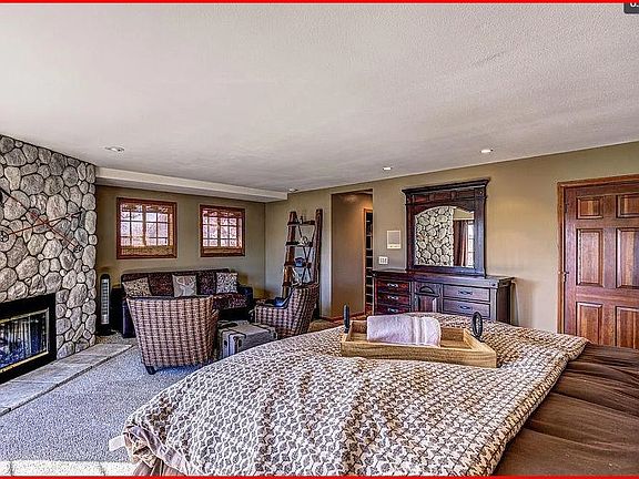 The main floor features a large living room with soaring wood-beamed ceilings, a striking stone-laced fireplace, and a spacious open wet bar perfect for entertaining guests. The large kitchen is well-appointed, with an adjoining dining area that leads out to a spacious balcony, ideal for enjoying outdoor meals and views.