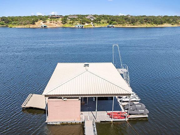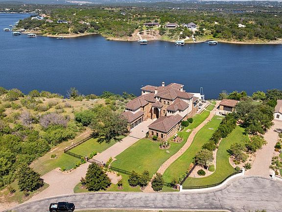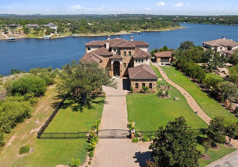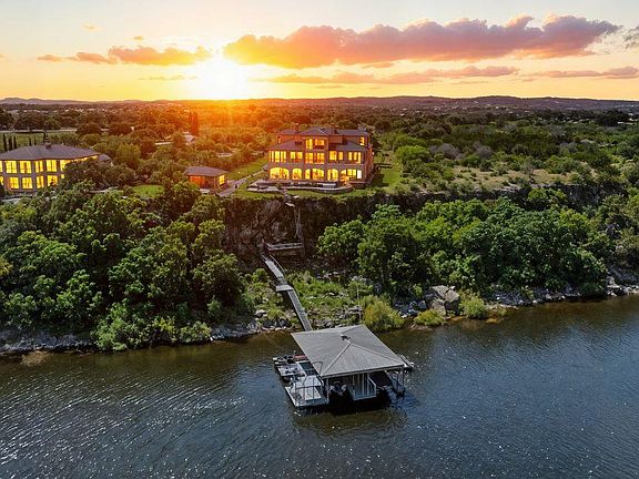 Lakefront estate on a bluff overlooking Lake Travis on the main channel with a private tram and boat dock. The exclusive Travis Bluff neighborhood is a gated cul de sac adjacent to Stone House Vineyard, near exclusive golf courses including Austin Golf Club, Barton Creek Lakeside, and Lake Cliff. The gated drive leads to two attached garages with six bays. This property offers 11,459 sq ft of conditioned space across three floors with elevator access. The primary bedroom is on the main floor and all seven bedrooms are designed as suites with walk-in closets and full baths so all guests enjoy a luxurious experience. One suite is secluded with a private hallway, staircase, and kitchenette, and can be an apartment for long term guests or support staff. The home features a Savant smart home system. The second floor is designed for entertaining with its 11 seat theater, equipped with luxury seating and a premium surround sound system. Just outside the theater is a full wet bar, a second dining area, and a living room with a second theater screen, making it the perfect area to host sports and entertainment events. The second floor also features a recreation room with rubber flooring and mirrored walls, four guest suites, and a powder room. The third floor includes an executive home office with a private balcony overlooking the lake. This level has two guest suites with one featuring a bonus twin bedroom within the suite. Outdoor entertaining revolves around a newly redesigned pool and spa with covered outdoor dining, two tvs and a cabana with two gas fire places and two tvs. Staying at Travis Bluff is an elevated experience on a low traffic area of the lake, one of the most coveted for water sports and fishing. The dock is accessed via a tram and stairs and has two new boatlifts and two motorized jet ski platforms, a storage room with wet bar, commercial drink refrigerator, and outdoor speakers.
