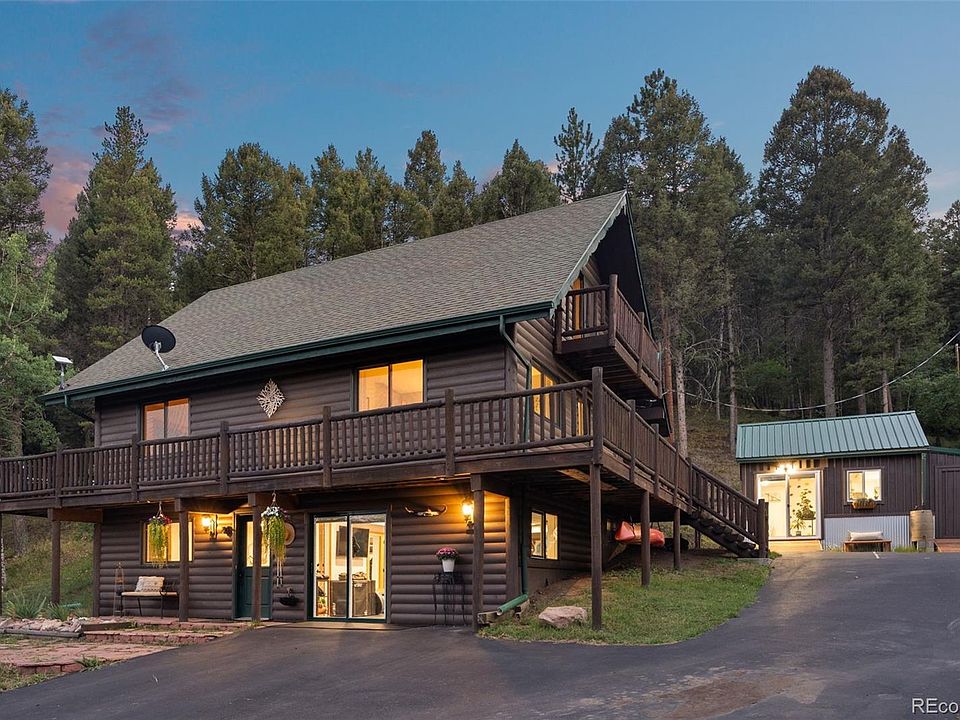 Perched on 2.6 acres the perfect mix of grassy yard w/mature forest in Conifer, 12161 Tecumseh Trail is a log sided two-story w/walkout basement balancing mountain serenity & everyday access. Highway 285 is minutes away, keeping you connected while preserving the peacefulness of home.