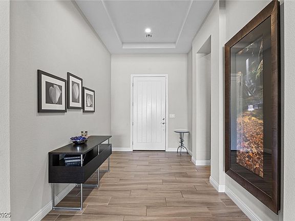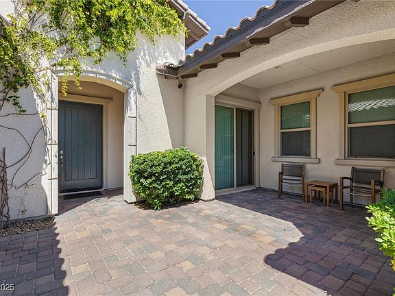 This home offers some of the best views of the Spring Mountains! The great room features a cozy fireplace and cathedral ceilings, opening to a chef's kitchen perfect for entertaining. Beautiful wood-style tile flooring runs throughout. The primary suite boasts a large, upgraded en-suite bath and a walk-in closet with convenient laundry access. Secondary bedrooms are spacious, each with its own en-suite bath and generous closet space. Enjoy breathtaking mountain views from your backyard, complete with fruit trees, a fire pit, and plenty of space for gatherings. If you love outdoor living and a well-maintained home in a fantastic community, this is the one for you!