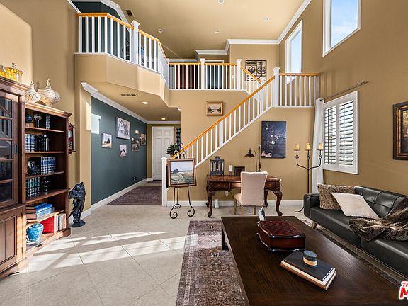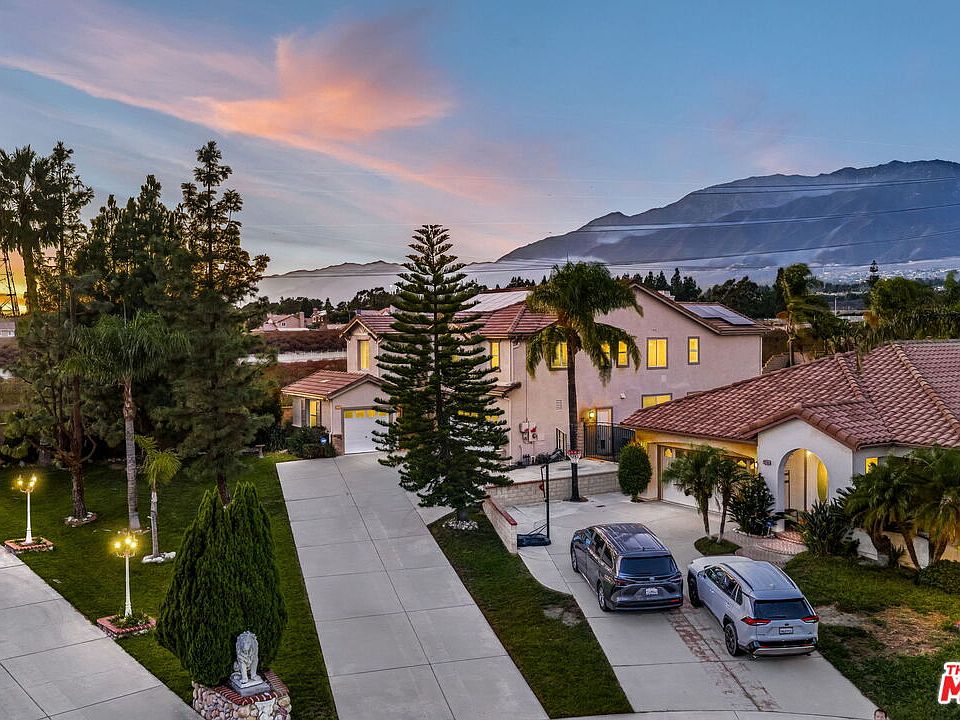 Nestled on a quiet cul-de-sac in one of Rancho Cucamonga's most coveted neighborhoods, this turnkey 5-bedroom home pairs everyday comfort with elevated style. Within the award-winning school district and surrounded by scenic trails and mountain views, the residence spans over 2,900 square feet of thoughtfully designed living space. The entry opens to an airy floor plan where formal living and dining rooms are framed by soaring two-story ceilings, creating a grand yet inviting atmosphere. The kitchen, bright and functional, connects seamlessly to the family room where a cozy fireplace anchors the space. A versatile main-floor bedroom or office and a full bath with shower add convenience and flexibility. Upstairs, the expansive primary suite is a retreat of its own, filled with natural light and sweeping views. It offers a generous walk-in closet and a spa-inspired en-suite bath with dual sinks, a soaking tub, and a separate shower. Three additional bedrooms, a full bathroom, and an upstairs laundry room provide comfort and ease for everyday living. The backyard is a private oasis designed for both relaxation and entertaining. A fully upgraded in-ground pool and spa take center stage, complemented by an outdoor fireplace, multiple dining areas, and a large grassy yard, all set against the dramatic backdrop of the mountains. Additional features include solar panels, a three-car garage with ample overhead storage, an extended driveway with room for multiple vehicles, and a wide paved side yard ideal for RV or boat parking. Just minutes from top-rated schools, shopping, dining, and major freeways, this home offers the best of both convenience and lifestyle in a truly sought-after community.