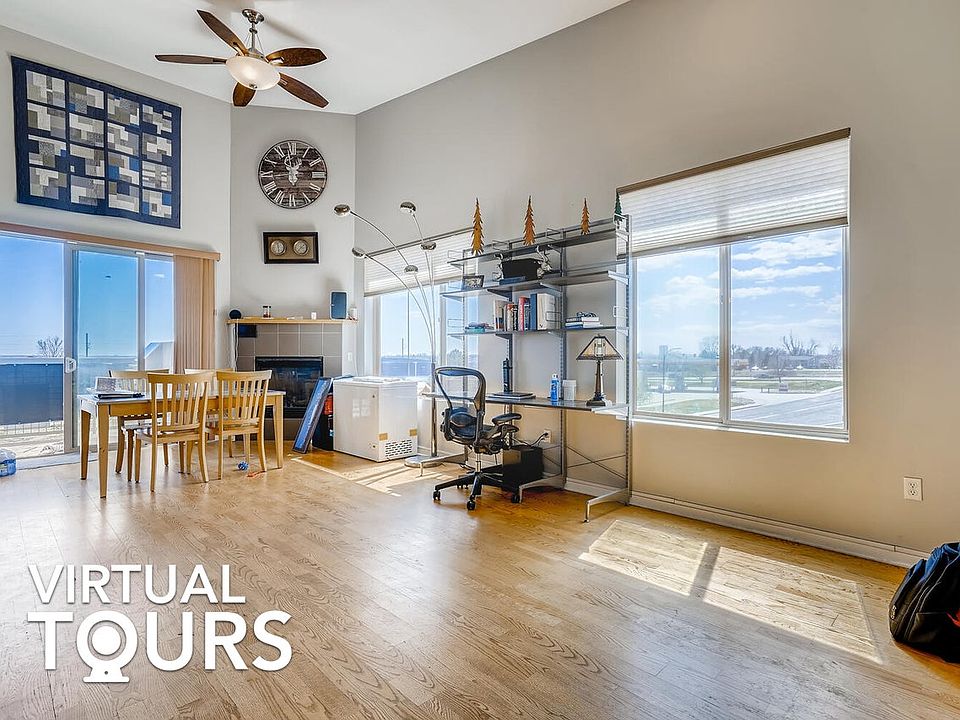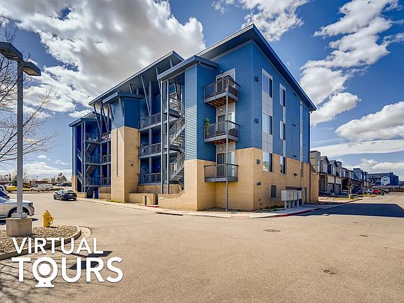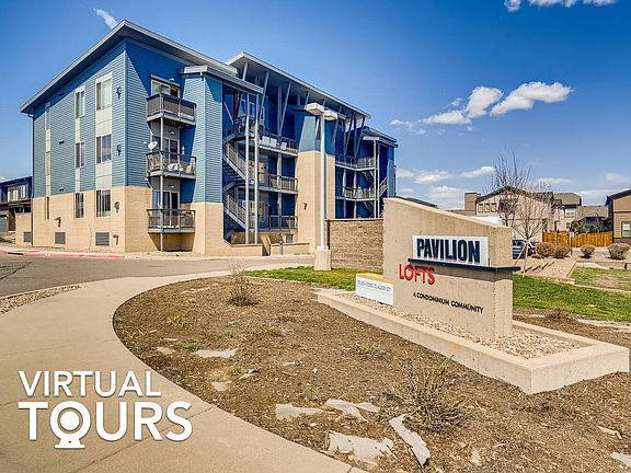 Mountain views from this bright and airy 2 bd / 2 ba condo in Northglenn's Pavilion Lofts! This top floor unit boasts two balconies, an open layout, and gourmet kitchen. Upon entrance, notice the abundance of natural light, reflecting off the wood floors and vaulted ceilings. Easily entertain between the living and dining spaces, which contain a built-in media center, fireplace, and sliding glass doors to one of the balconies. The kitchen brings the two together, equipped with granite countertops/backsplash, stainless steel appliances, recessed lighting, and a center island with seating and pendant lights overhead. Wind down in one of the two bedrooms; the primary suite offers a private balcony, walk-in closet, and bath, with a dual sink granite countertop, glass enclosed shower, and garden tub. The secondary bedroom is perfect for guests or an office and has access to the full hallway bath. Other features: Central A/C and Forced Air heating; New roof, water heater, and brand new heat pump for increased comfort and low energy bills; One underground parking spot. Elevator building with water, trash, and grounds maintenance covered by HOA. Conveniently located in close proximity to RTD Eastlake train station, Union Station, near parks/trails, shopping, and dining, with easy access to I-25 and Denver! Buyer should verify all information.