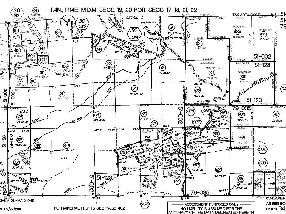93 acres in beautiful Sheep Ranch. Parcel is in the center of the map page with a circled number 7 above the 93.00 AC. The land was last occupied in 1984. Some structures remain.