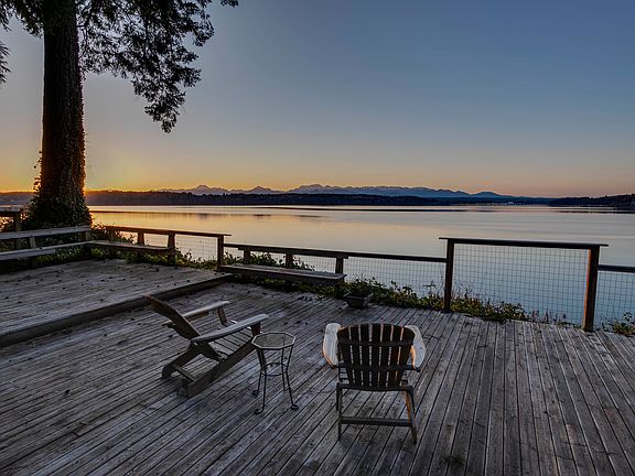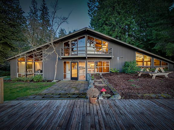 Mid-century modern style home set on a rare estate-sized 1.5-acre parcel features 182 feet of easily accessible waterfront and spectacular views of Puget Sound and the Olympic Mountains for world-class sunsets! Private and peaceful park-like setting with beautiful old-growth evergreens in one of the Island's most sought after locations. Easy walk to Battle Point Park and the Grand Forest trail system. One of a kind opportunity to acquire a premier waterfront property at an affordable entry price!