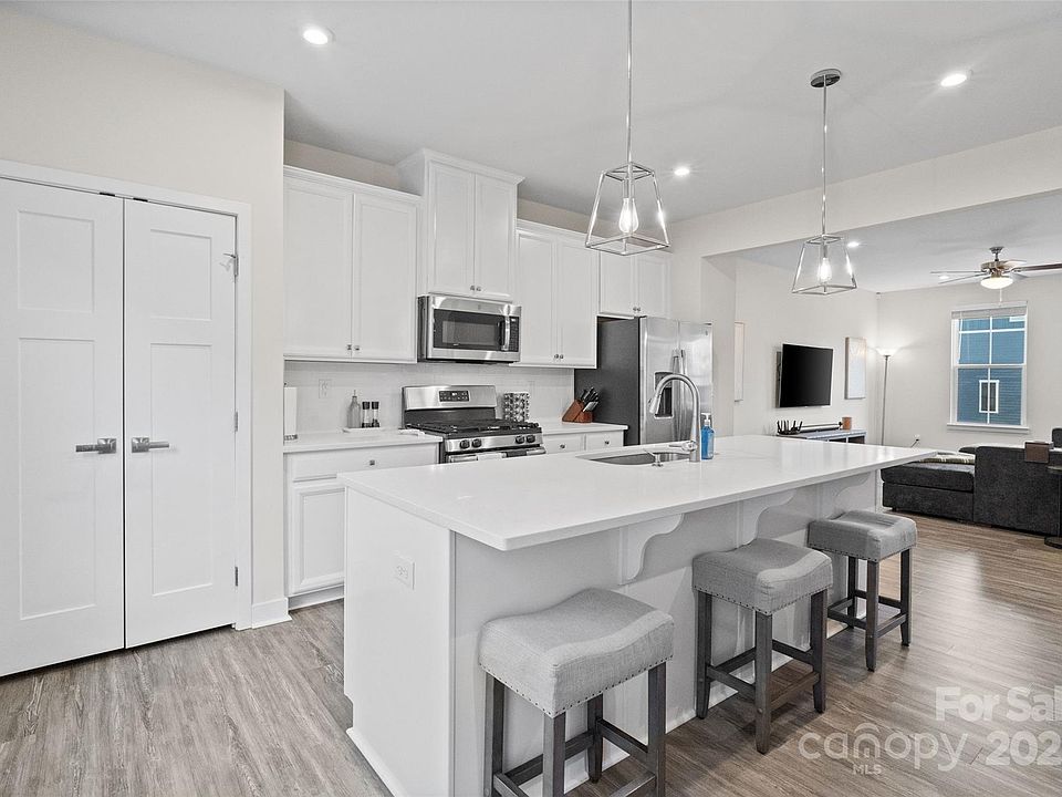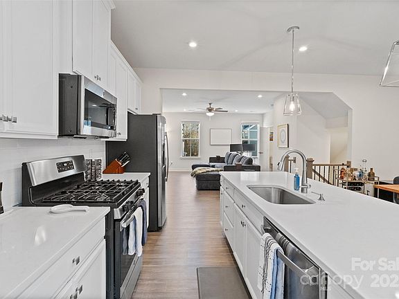 Modern Comfort Meets Everyday Convenience in North West Charlotte! This stylish, move-in-ready 3-story townhome offers bright, modern living in one of the city’s most connected locations. The entry level includes a flex room, half bath, and 2-car garage. Upstairs, enjoy luxury vinyl plank flooring, an oversized island, quartz countertops, a gas range, and an externally vented microwave. The kitchen and dining area flow into a spacious living room with recessed lighting and an adjacent half bath. A second-level deck provides a relaxing outdoor retreat. The top floor features a primary suite with a walk-in closet, dual vanities, and a glass-enclosed shower with dual shower heads. Two additional bedrooms, a full bath, and laundry complete the layout. Riverbend Village shops are adjacent to the neighborhood with shopping, dining, coffee shops, fitness all a short stroll away, and lake access just outside of the neighborhood. Plus, a 2.75% assumable mortgage for qualified buyers.