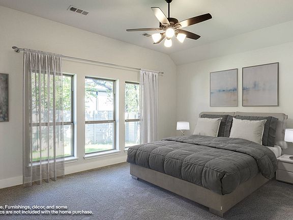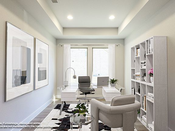 Home office with French doors off extended entry with 12-foot ceiling. Spacious family room with wall of windows opens to kitchen and dining area. Kitchen offers walk-in pantry, 5-burner gas cooktop and generous island with built-in seating space. Private primary suite includes bedroom with wall of windows. Double doors lead to primary bath with dual vanities, corner garden tub, separate glass-enclosed shower and large walk-in closet. This open one-story design features a guest suite with full bath. Abundant closet space throughout. Extended covered backyard patio. Mud room off three-car garage. Representative Images. Features and specifications may vary by community.