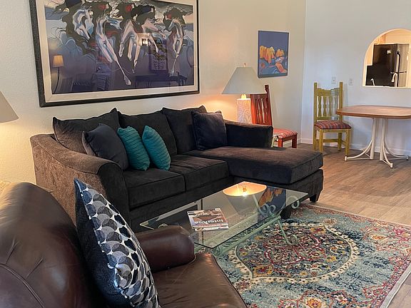 Great 2 bedroom/2 bath FURNISHED patio home with vaulted ceilings, beams ,fireplace and ceiling fans. Perfect for a winter visitor or possibly long term! This furnished unit has a 2 car carport . The complex backs to the greenbelt with access to miles of biking and walking trails. Available starting May 2024! Furnished rental! Minimum of 1 month. Owner/agent pays for trash,water,utlities and wifi . 300 cleaning fee. Currently looking for a short term renter. Rates may change depending on the months rented. Varies from 2000-2700 per month.