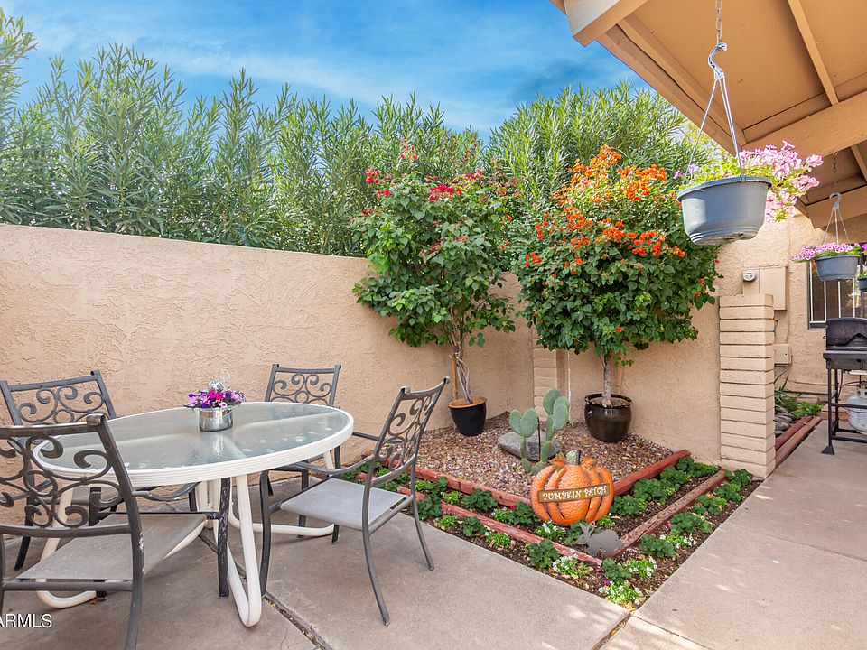 Remodeled & updated end unit in Scottsdale Gardens, this 1026 sq ft 2 BR 2 BA townhome shows pride of ownership. Vaulted ceilings in great room w/extra upper window for additional lighting give great ambiance. Newer tiled floor throughout main living area & wood plank tile floor in BR's. FRPL w/stone accents is a perfect addition. KIT has breakfast bar next to dining area. New dual paned French Doors from Great Rm & primary BR to private patio. Primary BR has spacious BA, walk-in closet & exit to patio. BR 2 is split & adjacent to remodeled Hall BA. Refrig & full-size W/D incl. Dual carport attached to townhome with flower garden & sitting area. Guest parking is also available. Community pool & spa. Fantastic Scottsdale location near restaurants, shopping, & more.