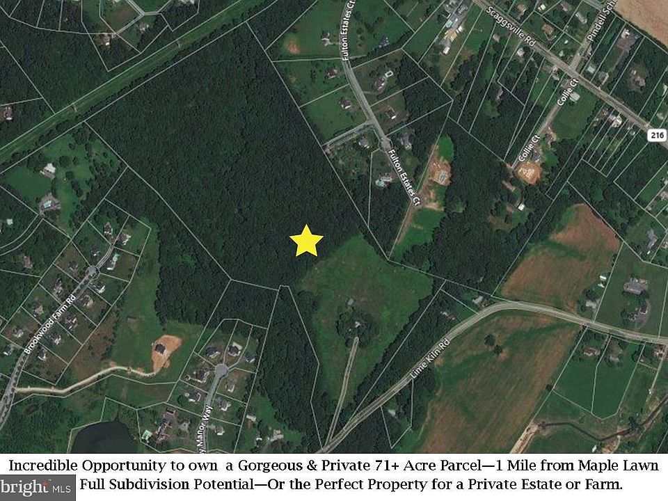 Incredible opportunity to own 71 beautiful & private acres close to Maple Lawn with full subdivision potential but would also make an incredible retreat, exclusive estate or working farm. This property has the perfect balance of open fields & wooded areas plus offers a pond, stream & trails galore. Existing house, detached garage & barn are in need of complete rehab. Buyer to pay ag tax.