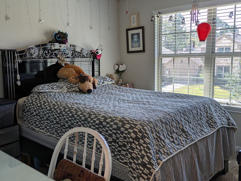 Room #1 - The Stars & Moon Room is a cozy room designed with stars and moon lights with amenities like own TV, small fridge, dresser with mirror, study table/chair, side table and storage closet near the shared bathroom. Rent=$1,000/month