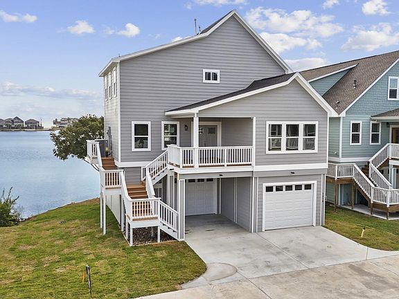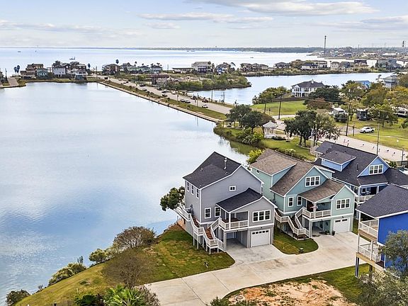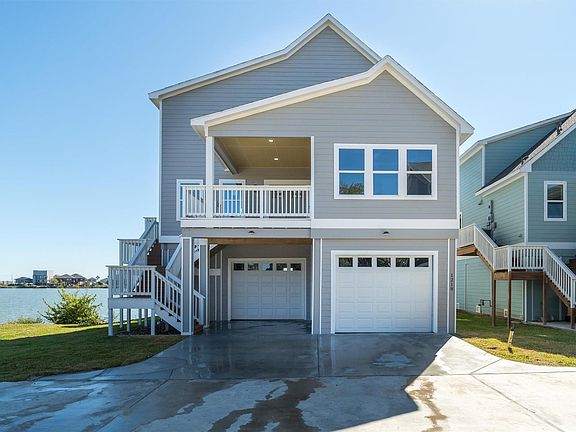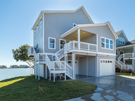One of a kind, new construction waterfront home elevated on pilings, offering modern coastal luxury with unforgettable views. Located on a quiet street in Seabrook, this 4 bed, 3 bath home spans 2,206 sq ft & includes two primary bedrooms, ideal for guests or multi-generational living. Inside, the home features designer light fixtures, beautiful luxury vinyl flooring & an open-concept layout filled with natural light. The chef’s kitchen is highlighted by quartz countertops, stainless steel appliances, breakfast bar & 3 ovens. Every floor boasts its own private deck overlooking a peaceful lake with wide views of Galveston Bay beyond. The upstairs primary suite offers an ensuite bath plus built-in dry bar or TV nook. Easy access to Highway 146, for a smooth commute to both Houston & Galveston. Walk to restaurants & shops in the heart of Seabrook. This elevated retreat features no HOA & low taxes, combining modern luxury with everyday convenience—move-in ready & truly one of a kind.