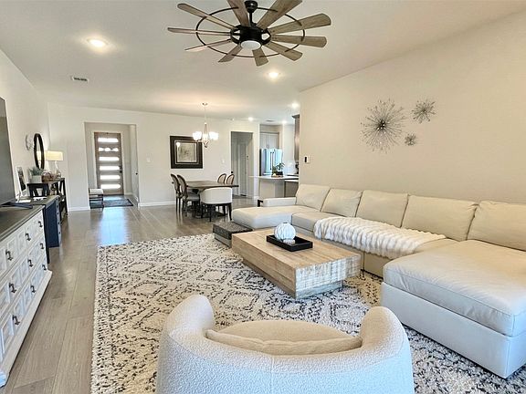 Thoughtfully designed open floor plan with lots of natural light, every inch of space is maximized for flow & functionality. Featuring 4 spacious bedrooms, 3 full bathrooms, PLUS 3-CAR garage and game room! At heart of the home is the stunning kitchen, chef's dream come true! Equipped with quartz countertops, under cabinet lighting, gas range & cabinets with additional lower pull-out drawers for all your storage needs. The kitchen opens gracefully to the expansive dining & main living area, creating seamless flow for entertaining. Beautiful Mohawk RevWood Laminate floors flow throughout home, making maintenance a breeze while adding a touch of sophistication. The home offers a flex space prefect for in-law suite, guest suite, home office, teen retreat, home schooling, or an oasis for kids, ensuring privacy without sacrificing style. The spacious flex room features built-in cabinets, mini fridge, sink & quartz countertops. Or if inside isn’t for you step outside to extended patio, ideal for building your dream outdoor kitchen, complete with gas access, which opens up to large private backyard perfect for gatherings or peaceful evenings. This home also comes equipped with modern amenities, including Brilliant smart home control panel, Tesla electric charging station, built-in pest control system from Taexx, Halo Touch smart door lock & Ring doorbell and driveway security camera for your peace of mind. Whether you value privacy, entertaining, or serene outdoor space, this property is ready to accommodate your every need. BONUS HOA COVERS: front yard maintenance, internet, full use of facilities, & management fees. Be sure to explore the community's many amenities, including multiple pools, dog park, walking & jogging trails, & so much more! NEW AC SYSTEM October 2025 5 ton unit with UV light technology!