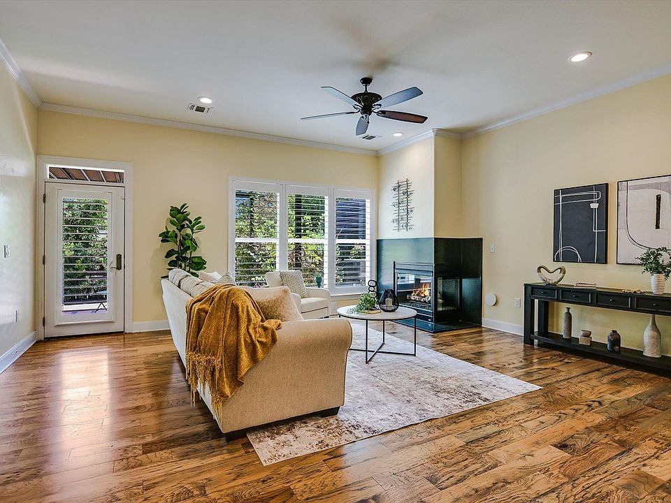 Refined detailsRich hardwood floorsQuality craftsmanshipPergola-covered patioInviting living spaceBonus roomCharming dining area