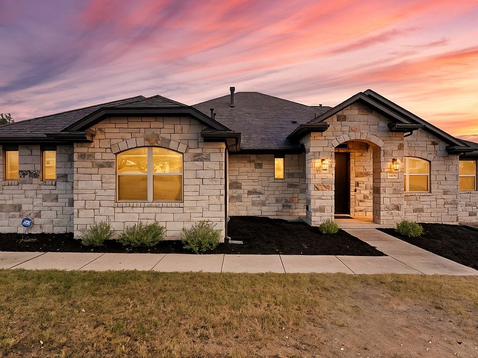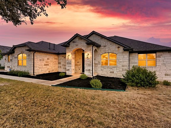 Welcome to hill country living on 1.13 acres in the highly sought-after Vintage Oaks community. Tucked away on a quiet cul-de-sac and backed by a greenbelt, this home offers privacy and space. An open-concept layout connects the main living areas, where a stone fireplace and crown molding create a warm, inviting feel. Wood flooring runs throughout most of the home, with the exception of two bedrooms, the bathrooms, and the laundry area, adding both style and continuity to the space. The kitchen features a gas stove, quartz countertops, tiled backsplash, plenty of cabinet space, and a large island accented with stone on one side; ideal for both everyday use and entertaining. The primary suite is tucked away on its own side of the home for added privacy. The bathroom includes separate his-and-hers closets, dual sinks, a large walk-in shower with a bench, a separate garden tub, and built-in shelving for extra storage. The two secondary bedrooms are connected by a Jack-and-Jill bathroom, offering convenience and functionality without sacrificing space. A dedicated office adds flexibility for working from home, school, or hobbies. A three-car garage and four-side rock exterior provide both practicality and curb appeal. The home also includes a water softener and two water heaters; one recently installed and the other being replaced. Outdoors, a spacious yard and outdoor fireplace create the perfect setting for relaxing or gathering with guests. Living in Vintage Oaks means access to resort-style amenities, including a Olympic size pool with a lazy river, clubhouse, fitness center, sports fields, walking trails, and more. Acreage, privacy, and a location that continues to hold its value. This property offers the lifestyle buyers are seeking in the Texas Hill Country.