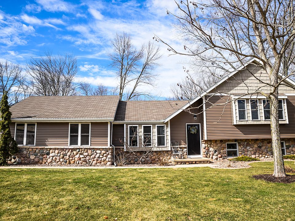 Completely updated home in super desirable Village of Hobart in Pulaski School District. Country living but minutes to West side Green Bay conveniences! Incredible lot over 2 acres with a serene creek running through the back. Kitchen features new cabinets, flooring, granite counters, and updated lighting. Great open concept floor plan made for entertaining! Lower level is a bar area and rec space! Additional heated detached garage for more storage or use it as a she-shed or man-cave! New brick paved patio for quiet country nights by the fire pit.