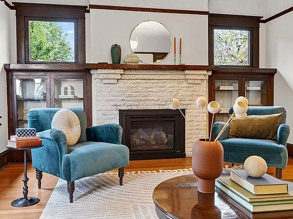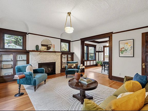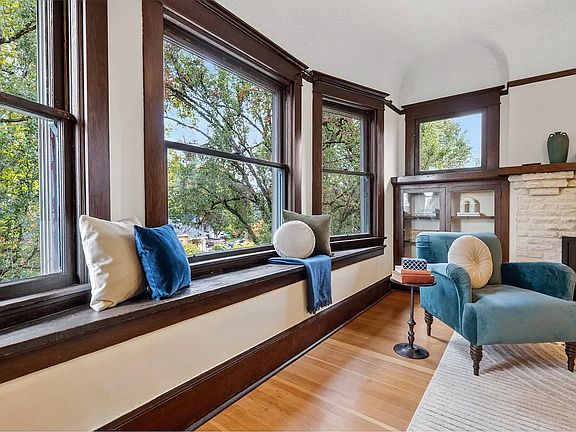 Highlights include a bayed living room window seat, pocket doors, picture molding, plate rail, wainscotting and fir floors.