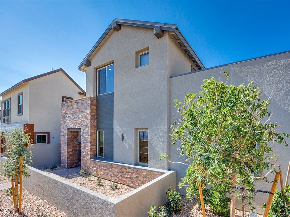 Modern living at Grand Park by Tri Pointe Homes, this Home blends seamlessly with indoor-outdoor style and the natural beauty of Summerlin’s western foothills. This brand-new 2,516 sq. ft. home features 3 bedrooms, 3 baths, and a 2-car garage all wrapped in sleek architecture and a smart, open layout. Inside, a flowing great room connects to a spacious, stylish kitchen—perfect for hosting or relaxing. The first-floor bedroom offers flexibility as a guest suite, teen retreat, or quiet home office. Off the dining area, a secluded loggia creates the perfect space for year-round outdoor entertaining. Upstairs, nearly all bedrooms offer privacy and calm. The primary suite features a massive walk-in closet with space to organize and impress. Enjoy cool evenings on the mirador, a covered balcony off the loft ideal for lounging, game nights, or study time. With multiple outdoor living areas next to Summerlin’s 90-acre Grand Park, this home is designed for vibrant modern living.