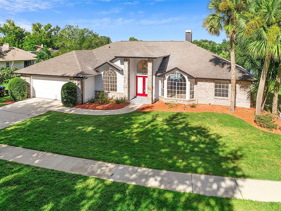 One or more photo(s) has been virtually staged. Experience waterfront elegance at its finest with this newly listed masterpiece on Almond Tree Court. Set on a half-acre lot with no front or rear neighbors, this stunning four-bedroom, three-bathroom estate offers breathtaking lake views, ultimate privacy, and turnkey luxury living. Updated from the ground up, the home features brand-new flooring, fully renovated kitchen and bathrooms, recessed lighting, and elegant modern fixtures, creating a perfect harmony of sophistication and comfort. Step through the grand foyer, where 14-foot ceilings, brick pillars, and double French doors with integrated blinds make a striking first impression. The open-concept floor plan effortlessly showcases the resurfaced pool and serene lake beyond, framing a perfect panorama that blends indoor elegance with outdoor tranquility—ideal for entertaining or peaceful retreat-style living. The formal living room, to the right of the entrance, features a charming wood-burning fireplace, while the adjacent dining area opens seamlessly to the heart of the home—the fully renovated kitchen. Culinary enthusiasts will delight in the quartz countertops, waterfall kitchen island, modern electric temperature-controlled faucet, and stacked convection oven with microwave. Expansive counter space and sophisticated finishes make this kitchen as functional as it is beautiful. The primary suite is a private sanctuary, offering sliding doors to the pool lanai and uninterrupted waterfront views. The spa-inspired bath features a standalone shower, jetted soaking tub, dual quartz vanities, and an expansive walk-in closet. Thoughtful design extends to pool access with a dedicated bathroom for easy entry, perfect for children or guests. Every detail has been considered for comfort and elegance: one of the guest bathrooms also features sliding doors with views of the pool and lake, the sprinkler system is fully programmable, and the chlorine pool boasts lights, a 6-foot depth, a waterfall, and recently updated plumbing, creating a serene retreat for relaxation or entertaining. Additional highlights include a 2017 roof, a 2021 AC system, washer and dryer, and proximity to top-rated schools, major freeways, and a wealth of family-friendly activities. With no compromise on privacy, space, or luxury, 1219 Almond Tree Court is more than a home—it’s a statement of sophistication, comfort, and lifestyle. Experience the perfect blend of elegance, modern upgrades, and breathtaking waterfront living in the heart of Orlando.