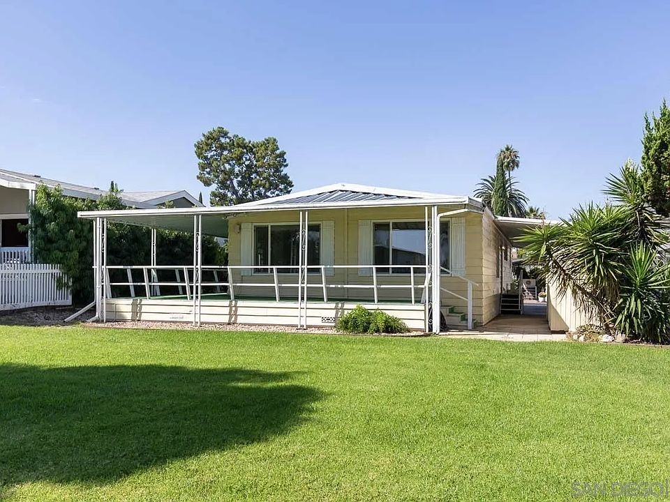 Rare Opportunity – Land Ownership Included! Skip the hassle of space rent and step into true ownership within the sought-after 55+ community of Casitas Del Sol. This spacious 2-bedroom + optional office/den, 2-bath mobile home showcases classic 70s character, central A/C, and tranquil greenbelt views right from the living room. A covered tandem carport for two vehicles plus two large storage sheds add convenience and functionality. The remarkably low $205/month HOA covers water, sewer, trash, & resort-like amenities! Enjoy a lifestyle that feels like a year-round retreat. Spend your mornings staying active in the fitness center or taking a refreshing swim in the heated saltwater pool, then unwind in the spa or sauna. Join neighbors for seasonal gatherings in the clubhouse, challenge friends to billiards, card games, puzzles, ping pong, or shuffleboard, or explore your creative side in the hobby rooms. Up to two Four-legged companions will love the dog park. For added convenience, RV rental storage is available (subject to availability), and visiting family can stay comfortably in the on-site guest house for a nominal fee. Everyday errands are a breeze with Costco, Walmart, and Nordstrom Rack nearby, plus endless dining and shopping options just minutes away. With quick freeway access and the Sprinter rail close by, you’re only 19 miles from Oceanside Pier & Harbor. Blending community, convenience, and the value of land ownership with no space rent—this is the lifestyle you’ve been waiting for.