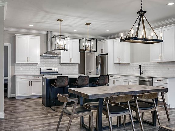 - Open floor plan: kitchen, including island, opens up to dining area and living area as well as side patio and front porch; living area all on one floor, separate from bedrooms; additional den/office off of living area and additional recreation room with built-in bar area, including refrigerator and sink, in basement
