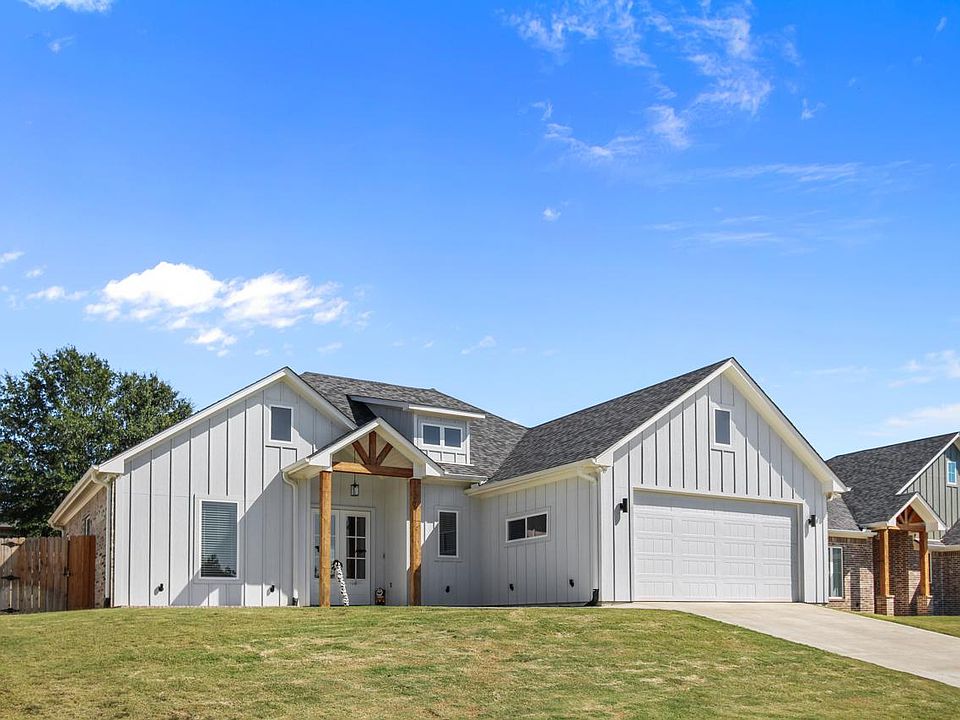 FREE RENT for first two weeks with the signing of a one year lease! Stunning Farmhouse Style home, located in the highly desired West Ridge Subdivision in Bullard. This open floor plan home boasts 3 bedrooms, 2 baths and 2 car garage. Luxury wood look flooring is throughout the house. The home enjoys lots of natural light, high vault ceilings & a rock fireplace. Chefs' kitchen offers high-end appliances perfect for those who love to cook, gas cooktop, smart oven, large 8x4 eat-in island & granite counter tops. Top of the line REFRIGERATOR included! Primary bedroom features a large walk-in closet, a spa-like bath with a soaking tub, oversized walk-in shower & a double vanity. Second and third bedrooms are generous in size. Outside enjoy a covered 26x9 patio with a perfect size fenced backyard and sprinkler system. All of this is in the coveted Bullard ISD!