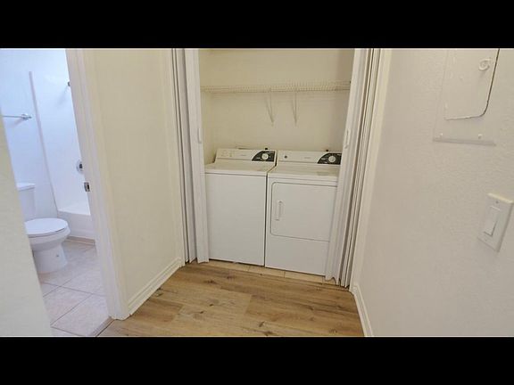 Apartment has IN UNIT WASHER AND DRYER, central AC, and a private patio with an additional storage room.