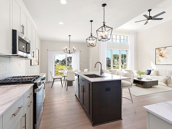 Welcome to your perfect retreat, an exquisite ranch villa nestled in a tranquil setting with picturesque views of a peaceful retention pond. This thoughtfully designed home features a sophisticated exterior, blending classic brick with durable LP SmartSide siding, premium Pella 250 series windows, and a spacious 12 x 12 covered patio ideal for outdoor relaxation. A beautifully designed interior will greet you as you enter through the grand 8' door with a secure 3-point locking system. The kitchen is a true masterpiece, featuring 42" off white cabinets, gleaming quartz countertops, a tiled backsplash, under-cabinet lighting, and a generous walk-in pantry for all your culinary needs. Adjacent to the kitchen, the family room welcomes you with soaring vaulted ceilings and refined crown molding. At the same time, the adaptable layout includes a charming dining room with crown molding and a butler pantry for those special gatherings. The luxurious primary suite is a personal retreat, offering a tray ceiling, comfort-height double vanity, a stunning 6' curbless seated shower, and a large walk-in closet with abundant storage space. Additional highlights include Hallmark vinyl-plank flooring in the main areas, 8' doors, crown molding, and wainscoting throughout the foyer for a grand touch, as well as an open basement staircase with rough-in plumbing ready for customization. Additional features include casing around windows, cased openings, and a laundry sink in the cabinet. Ideally located near shopping and major expressways, this villa offers both elegance and everyday convenience. Different floor plans and locations are available.