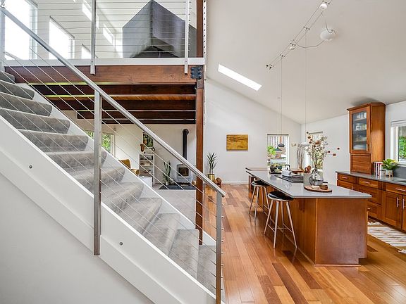 Serious chalet vibes in this stunning Northwest Contemporary home, on a 0.22 acre lot and tucked away amongst the trees alongside greenspace and meandering Fanno Creek. Two levels of high ceilings and lovely light in this smartly designed space: generous windows invite the outside in, and a wood burning fireplace adds a romantic touch. The spacious kitchen is open and modern, with granite counters, an island for communal gatherings, lots of cabinet space, and timeless style. Two cozy bedrooms, a bathroom, and a convenient laundry room on the main level. Upstairs, a luxurious primary bedroom with tall ceilings, skylights, an abundance of closets, and an ensuite bath - a serene personal oasis. This home presents exciting options for any lifestyle, with an additional 2 comfy, useful bonus rooms for a home office or music studio, and so much space for growth. Recent improvements include an expansive new wood deck off the kitchen and new carpet in the living room. Air conditioning is a welcome summer perk! Outside you'll find a chicken coop, raised beds, and lush green in every direction...a private urban retreat from city life. The attached two-car oversize garage is great for secure parking, storage, and weekend workshopping. Close to numerous parks, trails, schools, and easy commuting. When your home is this beautifully considered, every day can feel like you're on vacation.