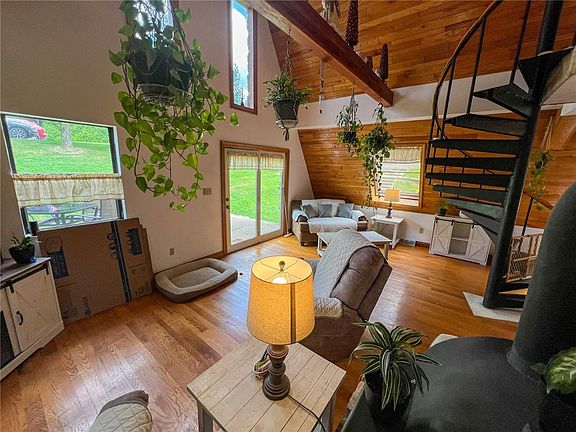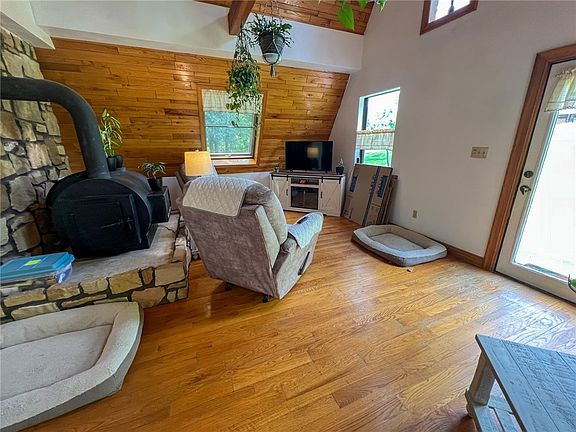 Nestled on just over 20 scenic acres, this charming two-bedroom stone A-frame offers the perfect blend of rustic character and modern comfort. The inviting living room showcases gleaming hardwood floors and a cozy wood stove, while the oak kitchen comes fully equipped with electric range, refrigerator, and dishwasher. A formal dining area provides space for gatherings, and the primary bedroom opens directly to a private deck—ideal for morning coffee or evening relaxation. The finished lower level expands your living space with a family room and a full second kitchen, perfect for entertaining or multi-generational living. A large detached garage accommodates up to six vehicles, and both the home and garage boast brand new metal roofs for peace of mind. Outdoors, you’ll enjoy the wide-open acreage, complete with a picnic shelter that sets the stage for summer cookouts and memorable gatherings. In addition to the well, home is served by a natural spring with just the flip of a switch!