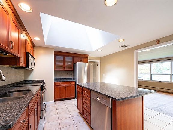 Welcome home to this beautiful three-bedroom, two full bath ranch offering the perfect blend of style and comfort. The granite kitchen features an island, stainless steel appliances, and cathedral skylights that flood the space with natural light. The open layout flows seamlessly into the dining area and family room with a cozy fireplace – ideal for gatherings. A separate living room provides access to the fenced in backyard with a patio, perfect for outdoor entertaining. The newly finished basement offers a versatile space for lounging, a playroom, or a home gym. Additional highlights include central air, upgraded gas on demand heating system for efficient heat and hot water, cedar closet and plus a two-car garage. Great location close to highway, shopping and restaurants.