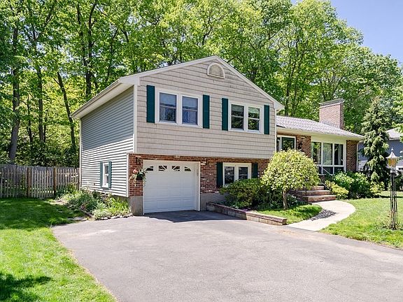 Well maintained multi-level ranch on a quiet dead-end street in Precenct 1, Dedham's finest neighborhood. This home features 3+ floors of living space, perfect for a young family or someone who works from home. With 3 bedrooms on the top floor, living/dining/kitchen space on the main level, and a den/home office and finished basement below, the choices are endless. Located on the Westwood line, there are woodlands abutting the backyard for a nice rural feel. Hardwood floors and vinyl replacement windows throughout the home and a newer (2016) roof. The kitchen/dining area leads directly to the deck overlooking the fenced-in back yard accented with waterfountain, flowers,small trees & shrubs. With wood burning fireplaces in both the living room and the family room the home is warm & cozy year-round plus Central air for those upcoming hot, steamy nights too. The baths retain their original tile and ooze retro charm. Attached garage and a dedicated laundry room make this house a keeper!