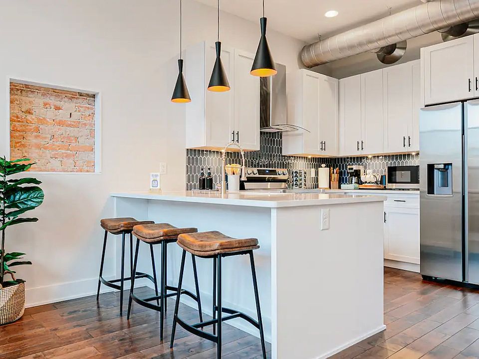 Natural lightHistoric exposed-brick charmCozy sleeper sofaKing-size bedGlass showerCalacatta quartz countertopsSmart tv