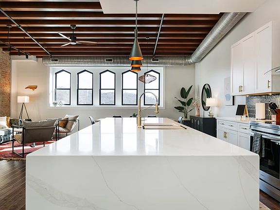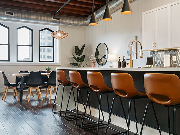 With luxurious amenities such as a full-sized washer and dryer, high-speed WiFi, and king-size beds in every bedroom, this spacious two-level home is the ideal choice for your next rental. Two couches offer plenty of seating for a movie night, or the Samsung Frame TV can be set to art mode for relaxing with wine and friends. Beautiful modern lighting fixtures provide light while creating mood and ambiance. The interior has been custom-built and designed to focus on the historic elements of the building, embracing a downtown industrial loft aesthetic. Another comfortable sitting area can be found on the other end of this level. With a cozy couch and two chairs, it's a great area for socializing with pre-dinner cocktails.