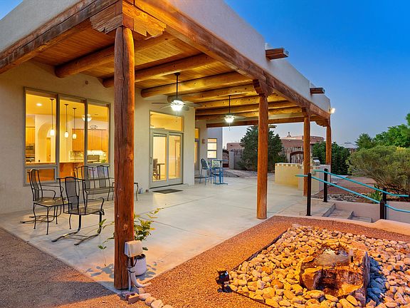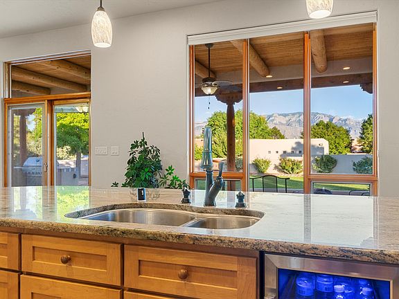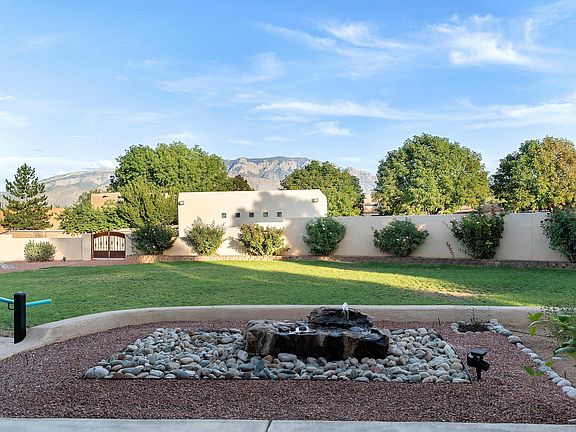 Welcome to this stunning Single Level Pueblo Style home in the Village of Corrales. The grand entrance w/skylight showcases newer hardwood floors leading to a spacious living room adorned w/cedar wood ceiling, vigas, & a cozy gas fireplace w/stone accents w/natural light. Revel in mountain views from the gourmet kitchen w/granite countertops, a large pantry, built-in desk, ample cabinets, wine cooler, & separate dining area. All complemented by 6-Burner Thermador Gas Stove. The primary suite offers patio access & a beautifully remodeled bathroom w/custom accents, porcelain tile, soaking tub & large shower, double sinks. Features include; covered patio, lush landscaping w/water feature, a circled driveway w/electronic gate, backyard access w/676+- sq ft shop/garage, & abundance of storage!