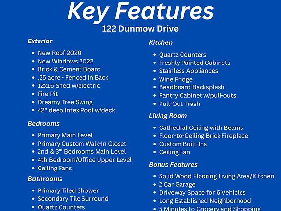 ** Ask about possibility of 1% rate reduction ** Welcome to 122 Dunmow Drive in the sought-after Briarwood neighborhood, close to downtown Summerville! This charming 4-bedroom, 2-bath home offers a beautifully updated interior and a backyard made for relaxing and entertaining. 3 bedrooms, including the spacious primary suite, are conveniently on the main level, while the versatile 4th bedroom upstairs can serve as a guest room, home office, or bonus space. Step inside to find stunning solid wood floors flowing through the main living areas. The inviting living room features a cathedral ceiling, a striking floor-to-ceiling brick fireplace, and a full wall of custom built-ins. The kitchen has been thoughtfully updated with ample freshly painted cabinetry, sleek white quartz countertops, plus an additional butcher block counter area with wine fridge, stainless steel appliances, beadboard backsplash, pull-out trash cabinet, and a full-size pantry cabinet with pull-out shelving. Charming eat-in area with Bay Windows to back yard. The primary suite includes a custom walk-in closet and a beautifully updated bathroom with quartz counters, tiled shower, and tiled flooring. Other updates include a new roof (2020) and stylish new windows (2022) for peace of mind and energy efficiency. 2 Car attached garage, plus room for 6 additional vehicles in large driveway. Enjoy outdoor living in the fully fenced backyard featuring two privacy side gates (one wide enough for vehicle access), a 12x16 shed with cement plank siding and electric, fire pit, dreamy tree swing, and a 42" deep Intex pool with deck - perfect for summer days! Ideally located just 5 minutes from several grocery stores, as well as popular restaurants, shops, and everyday conveniences. Pine Trace Park is one of Summerville's newest outdoor destinations, just an 8 minute drive from Briarwood, featuring 300+ acres, including a beautiful huge pond with kayak rentals(or bring your own), Fishing Pier, Disc Golf Course, 6 miles of scenic walking trails, large beautiful pavilions, open green spaces and picnic areas, a modern inclusive playground, small or large dog parks, dog washing station, and concession stand. This home offers the perfect blend of comfort, character, and convenience - a true Summerville gem!