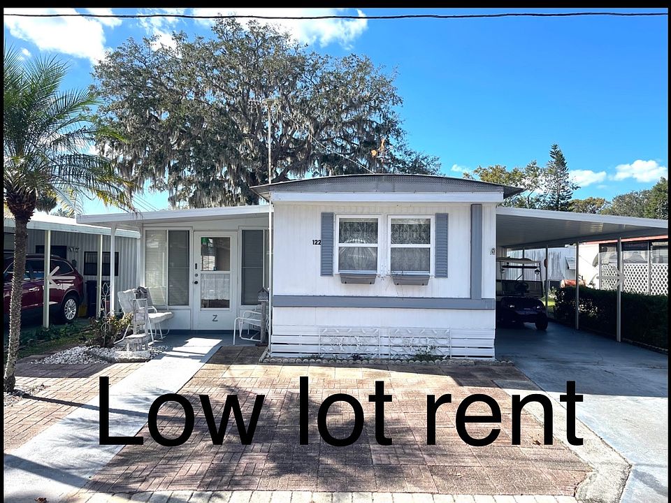 Low lot rent of $579 and includes w/s/t! This well maintained home is a single wide but has a nice addition that gives it a spacious feeling at a budget friendly price! You enter the home right from the large carport through the shed, which acts like a mudroom/laundry area. The eat in kitchen features nice wood cabinetry and is adjacent to the Florida room for morning coffee. You have a nice size livingroom, too.The Florida room has a large adjacent bedroom with an attached large bathroom with lots of storage. The second bedroom is located in the back of the home next to another full bathroom. The home is located in pet friendly Tiki Village which has one of the lowest lot rents in the area of $579 which includes water, sewer and trash. You have access to the Dora Canal right from the community marina so you can travel miles of waterways and enjoy some great fishing. Tiki Village offers convenient access to highways and nearby shopping, entertainment, healthcare facilities and restaurants.You will truly feel like every day is like a vacation when you own this lovely home!