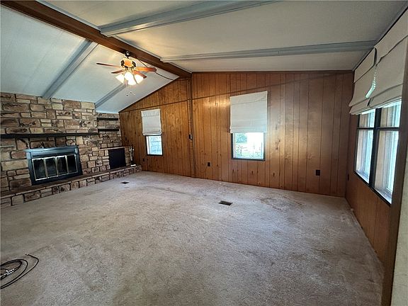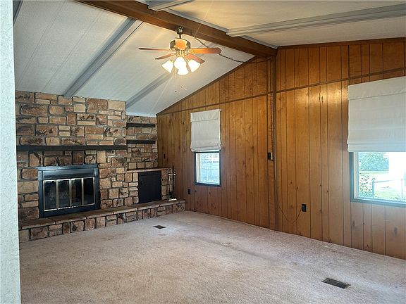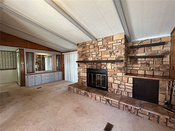 This Double-wide trailer has a lot of great features but requires a little TLC. It has a spacious living room with a stone wood fireplace, perfect for cozy evenings. The separate dining area from the kitchen has a built-in hutch, and the kitchen is equipped with white cabinets, an island, and a spacious dining area. There is also an enclosed back porch, and the yard is fenced in and includes a shed for extra storage. The enclosed back porch has many possibilities. The roof is estimated 10 yrs and the furnace and central air about 3yrs. Hot water tank 2024