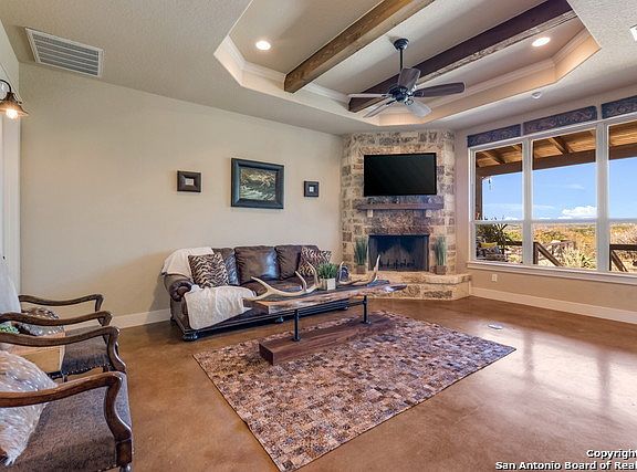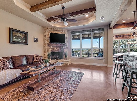 Nestled in Boerne in the heart of the Texas Hill Country. Featuring a stunning, 2013 built, high quality, four bedroom, study, three and a half bath custom home with an open floorplan, and spacious kitchen. Timeless homestead designed with beautiful finishes and wood beam accents, a large covered patio with outdoor kitchen and entertaining space, a 3 car oversized garage, circle driveway and stunning infinity pool. Beyond the glass are soaring Hill Country views in every direction! Meticulous grounds & thoughtful hardscape commands views of the hill country & seasonal creek, making it an ideal location for this one-of-a-kind estate! Covered outdoor living area along side the pool has a commercial grade cooktop, 30 amp service, is wired for stereo and features a wood burning fireplace. On Property is a 2000 sqft workshop that has 50 amp service, insulated roof and is plumbed for shop air! Plus neighborhood access to an 18 acre private park with a mile of river access, a bath house and a pavilion! This paradise will not last long!