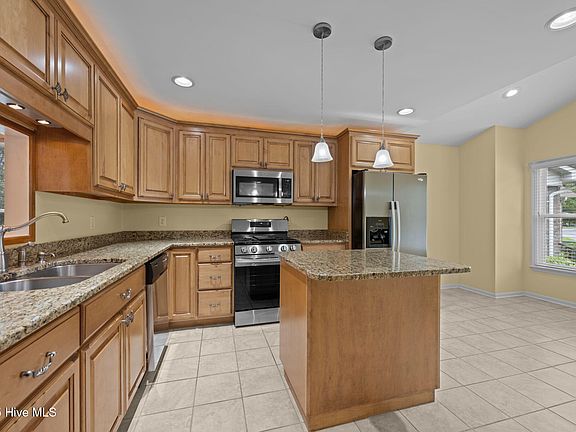 The light-filled living room features vaulted ceilings, hardwood floors, and a gas fireplace, flowing into a kitchen with custom maple cabinetry, granite countertops, center island, pantry, and sunny dining area. The home is serviced by natural gas and includes a Rinnai tankless water heater for energy-efficient comfort.
