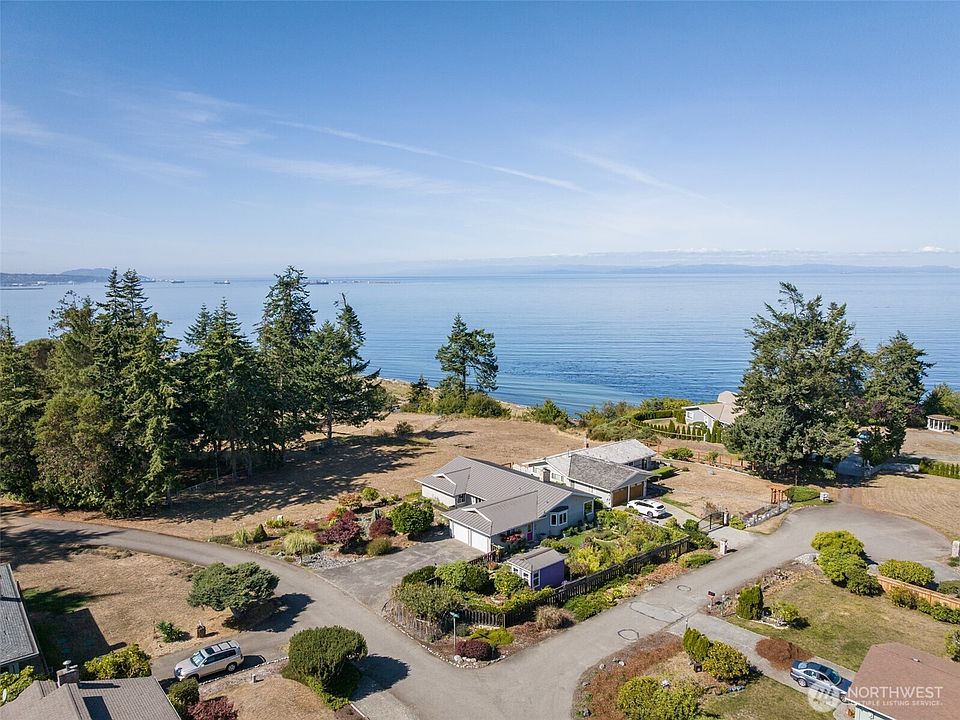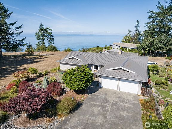 Fall in love with this exquisite single-story home featuring 4 bedrooms and 2.5 baths in a lovely neighborhood with views. The striking metal roof and vaulted wood beam ceilings create an inviting atmosphere, while hardwood and tile floors add elegance throughout. The kitchen boasts stainless appliances, granite countertops, seamlessly flowing into the dining area. Enjoy cozy evenings by the double-sided wood fireplace in the living and family rooms. The primary suite offers a private slider to the backyard, showcasing views of the Strait of Juan de Fuca and Mount Baker. Outside, a vibrant yard brimming with lush plants; perennials, fruit trees, raised beds, and an enclosed front patio along with a customizable outbuilding. Come see!