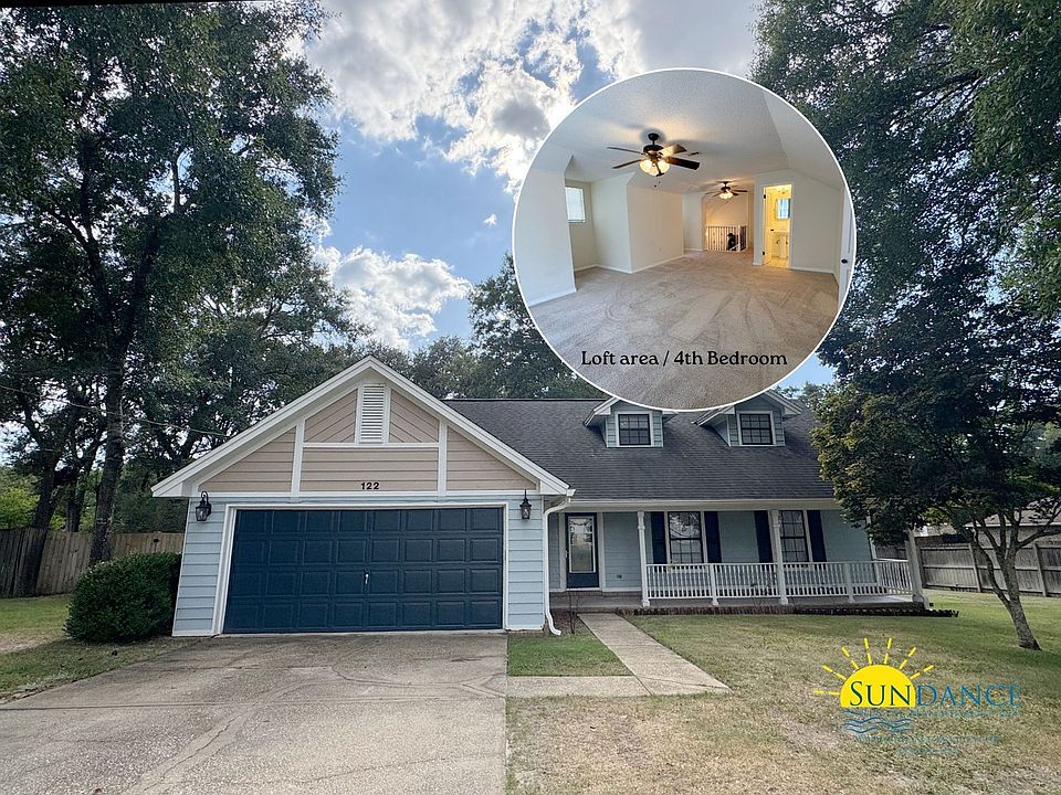 Located in the heart of Crestview just minutes from shopping, dining, and everyday conveniences, this beautifully designed 3-bedroom, 2.5-bathroom home is a must-see! Featuring a spacious 2-car garage with additional driveway parking, this home offers both style and functionality. Step inside to a bright and open living area with abundant natural light. The fireplace is non-functional and cannot be used. The split-bedroom floor plan provides added privacy, while the upstairs loft/bonus room offers flexible space for a home office, playroom, or media area. The chef-inspired kitchen boasts stainless steel appliances, granite countertops and ample cabinet space that flows seamlessly into the dining area, perfect for entertaining. The first-floor primary suite includes a walk-in closet and a dual vanity bath. Enjoy the outdoors in your fully privacy-fenced backyard, complete with an open back patio ideal for relaxing or hosting guests. Additional features include washer/dryer hookups and modern finishes throughout. Don't miss the opportunity to call this Crestview gem your new home!