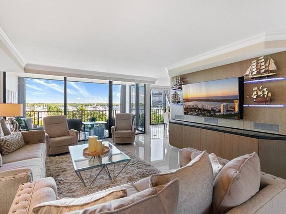 Tastefully renovated 2BR/2BA split-bedroom convertible floor plan in Quay South. This 5th-floor condo offers beautiful marina and Intracoastal views. The updated kitchen features modern cabinetry and stainless steel appliances. The spacious primary suite includes a walk-in closet, a tub/shower combo, modern cabinetry with ample storage, and a new washer and dryer. The guest bathroom has been upgraded with a walk-in shower.The convertible bedroom includes a closet and functions as a full second bedroom. Built-in entertainment centers in both the guest bedroom and living room add style and storage. Enjoy gorgeous views from every room and take in the sunrise from your private balcony. Additional features include one assigned covered parking space, guest parking, a waterfront pool, fitness center, and a 24-hour manned gatehouse. Conveniently located near shopping, dining, golf, tennis, and miles of beaches.